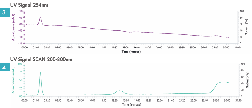 圖3與圖4:紫外檢測下化合物不可見(jiàn)。檢測初期首波化合物開(kāi)始顯現低強度信號,但強度不足以實(shí)現有效收集